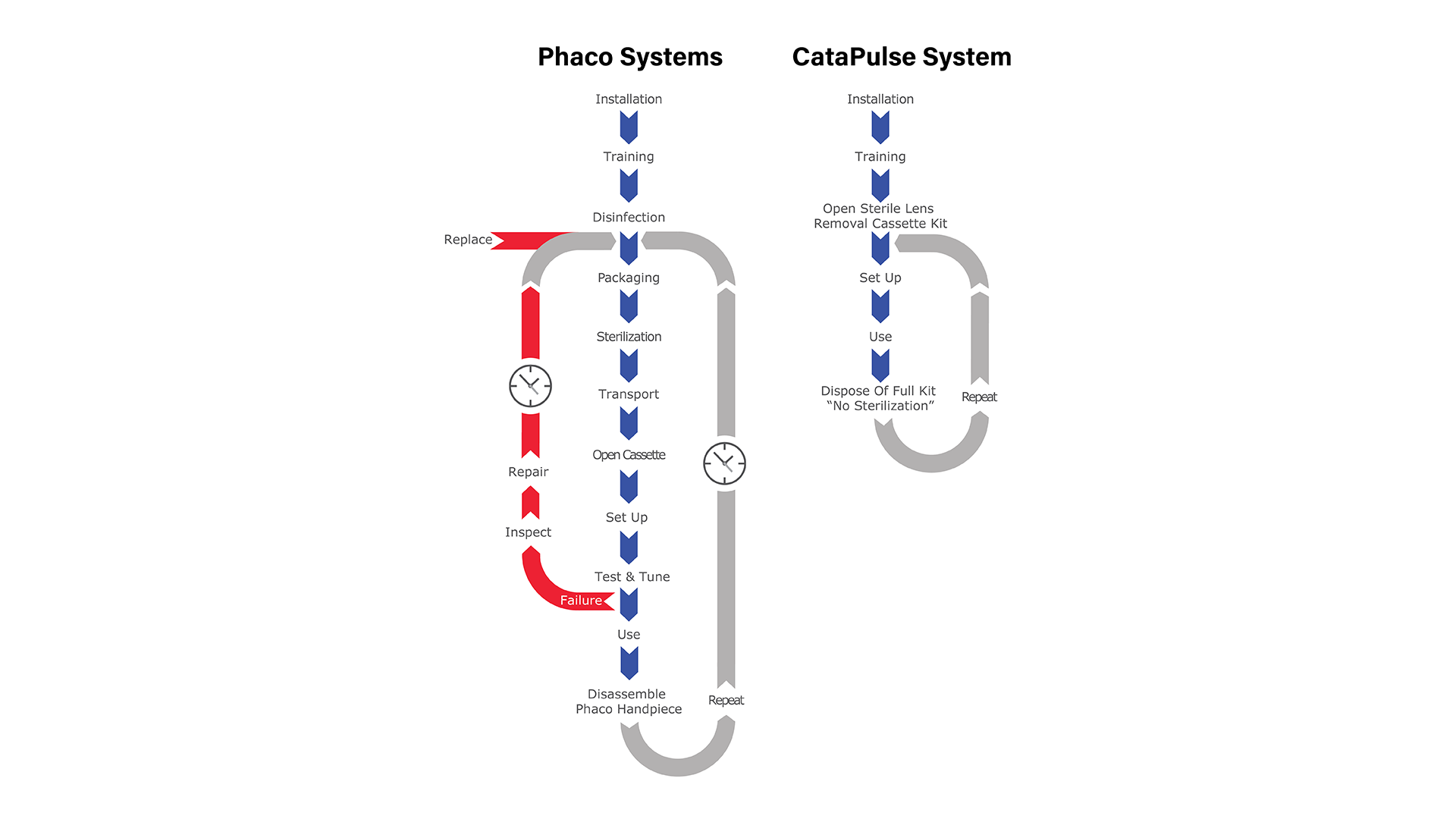 By using the CataPulse®, several steps associated with Phaco become eliminated. The CataPulse® Lens Removal Kit includes the Lens Removal Handpiece, Irrigation Handpiece, and Sterile Drape. All come preassembled and ready to use out of the box. Just attach a cannula of your choice and insert the Lens Removal Cassette and the system is ready to use. The diagram below illustrates the simplifying effect the CataPulse® has on OR operation during cataract procedures, which translates to a faster return on investment.