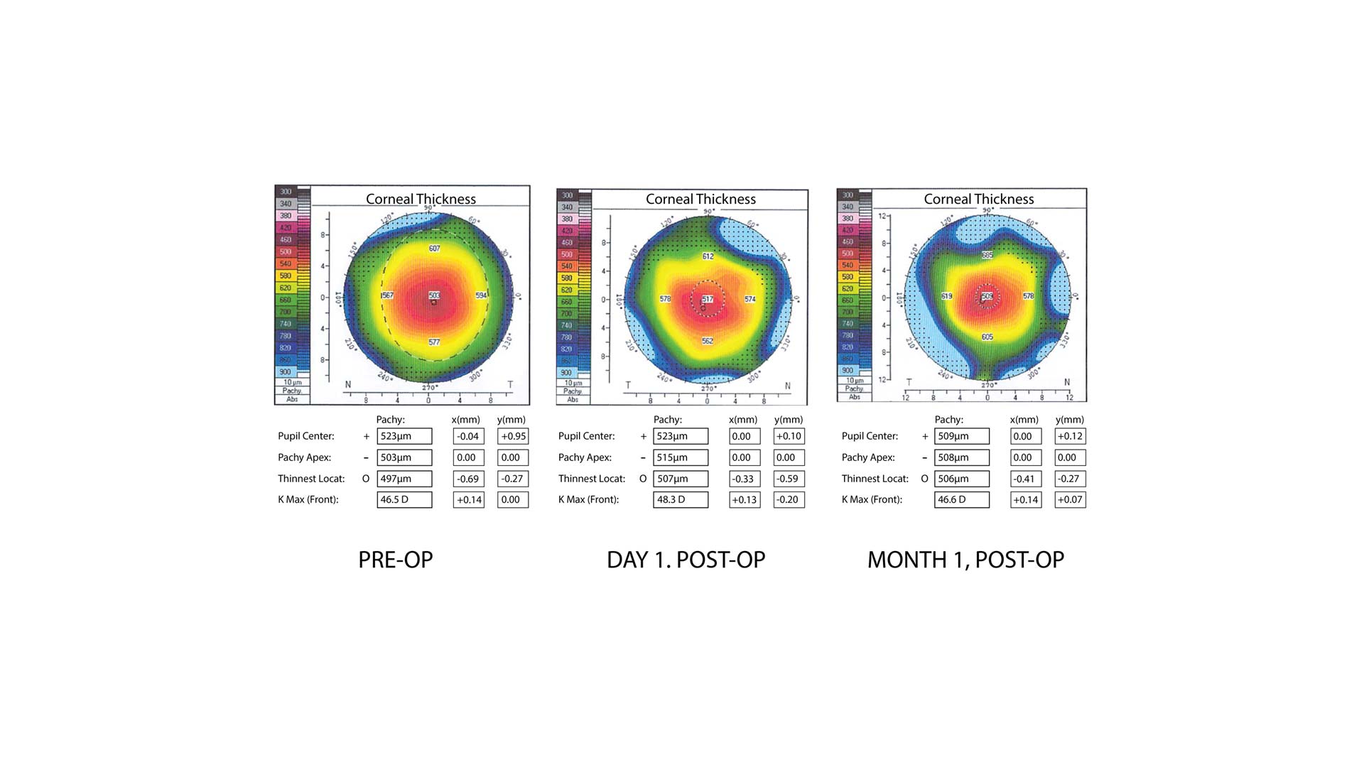 The 73 subjects of the study were scheduled to be evaluated at baseline, 1 day, 15 days, and 30 days post-op. All but two subjects were evaluated as scheduled. Two subjects missed the 15 day follow-up but were evaluated at baseline, 1 day, and 30 days. There were zero adverse events or complications throughout the study.