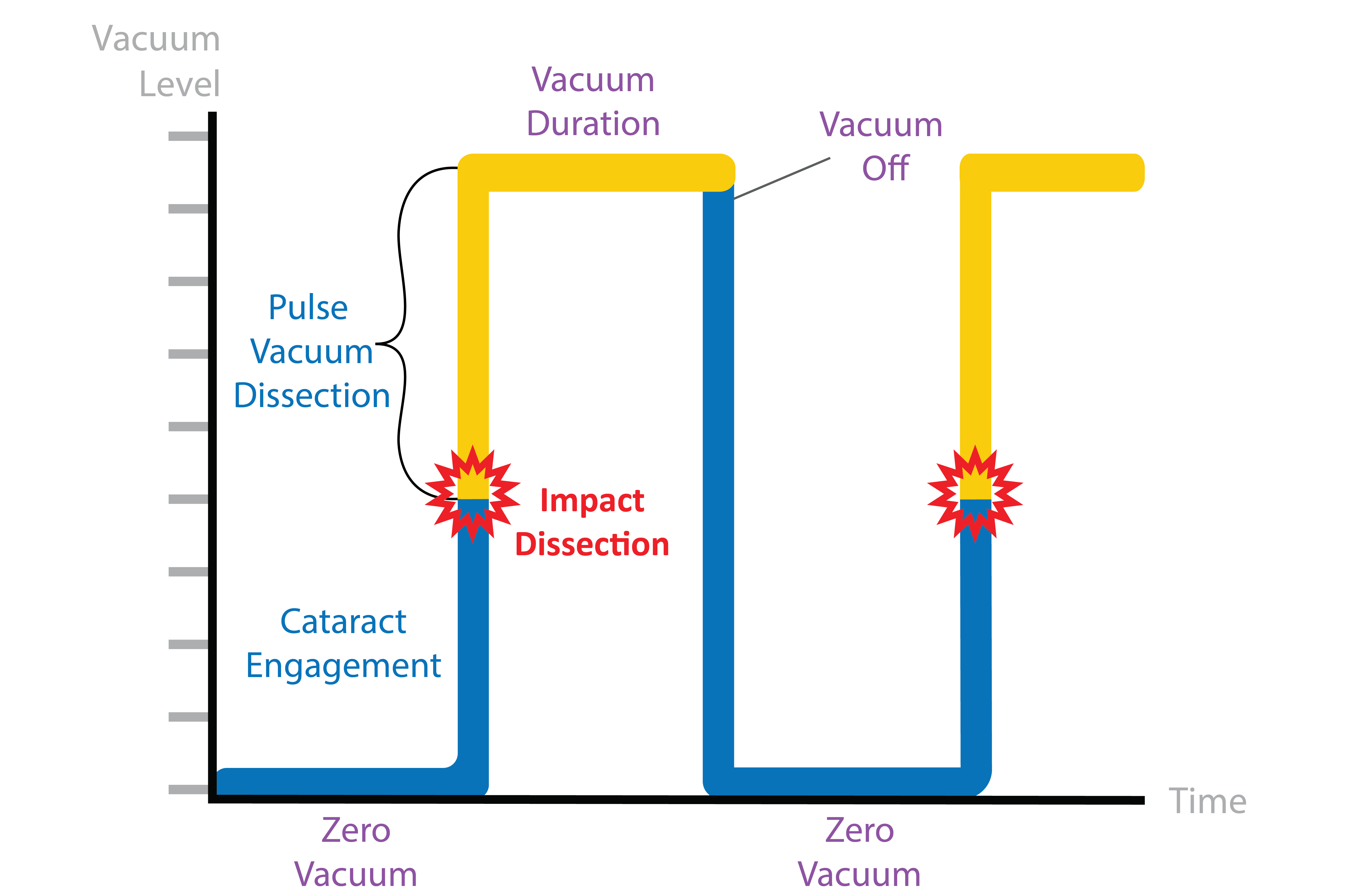 The "pulse" is generated by interrupting the vacuum at a set interval of time, ranging from 450 pulses per minute to 800. At a preset vacuum value, the High Frequency Pulsed Vacuum activates and begins dissecting tissue. The effect is an isolatied micro-impact between the cataract material and the tip of the cannula. The diagram below illustrates the concept of high frequency pulsed vacuum.
